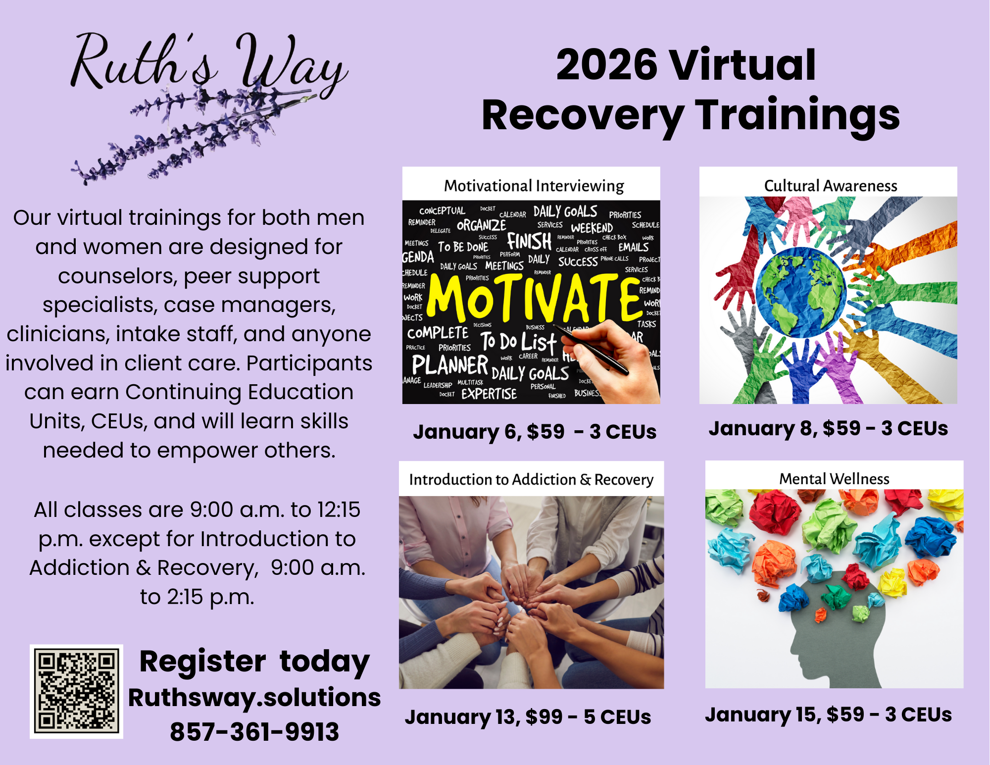 This 3-hour training session focuses on exploring and developing collaborative conversation skills. The aim is to help participants build rapport and assist individuals in navigating the stages of change. This training is designed to help individuals resolve ambivalence and support their efforts to make positive changes. 3 CEUs January 6, 2026, $59, 9:00 a.m. to 12:15 p.m.
